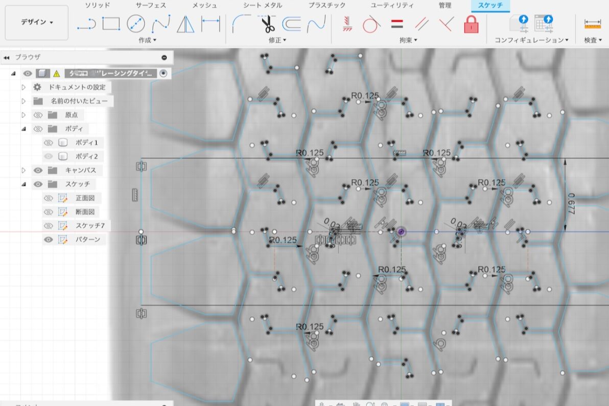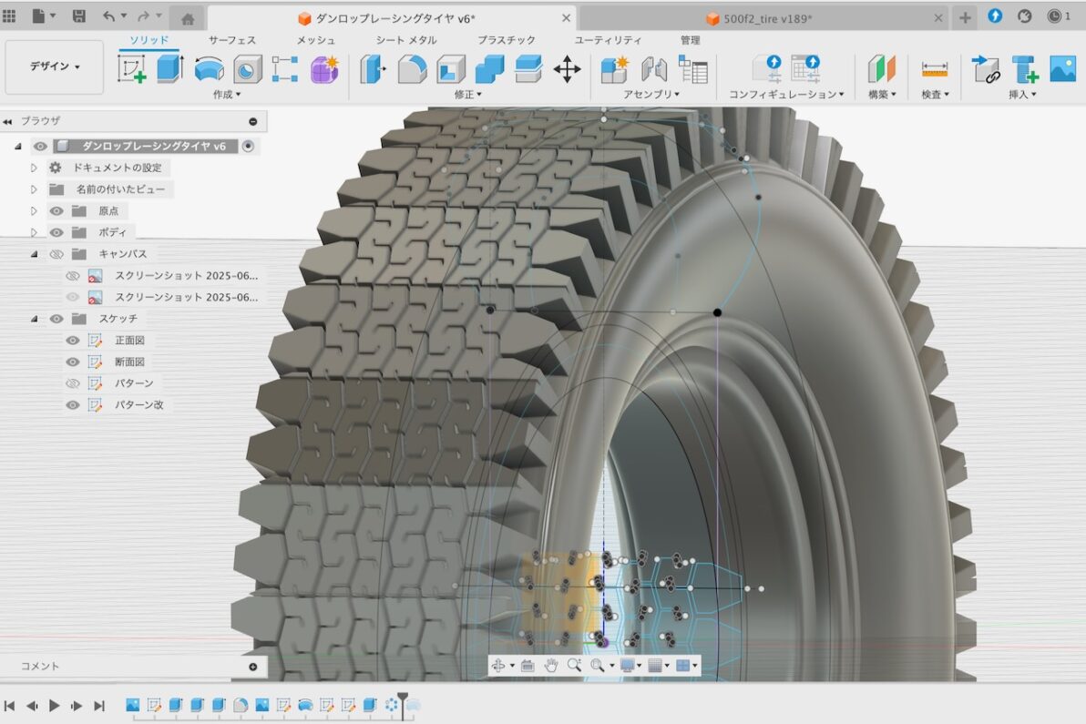 トレッドパターンは実物の画像を下絵に読み込み、輪郭をトレースして「押し出し」でブロックを作ります。