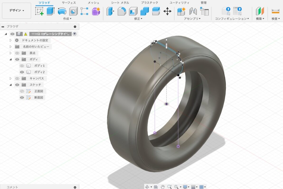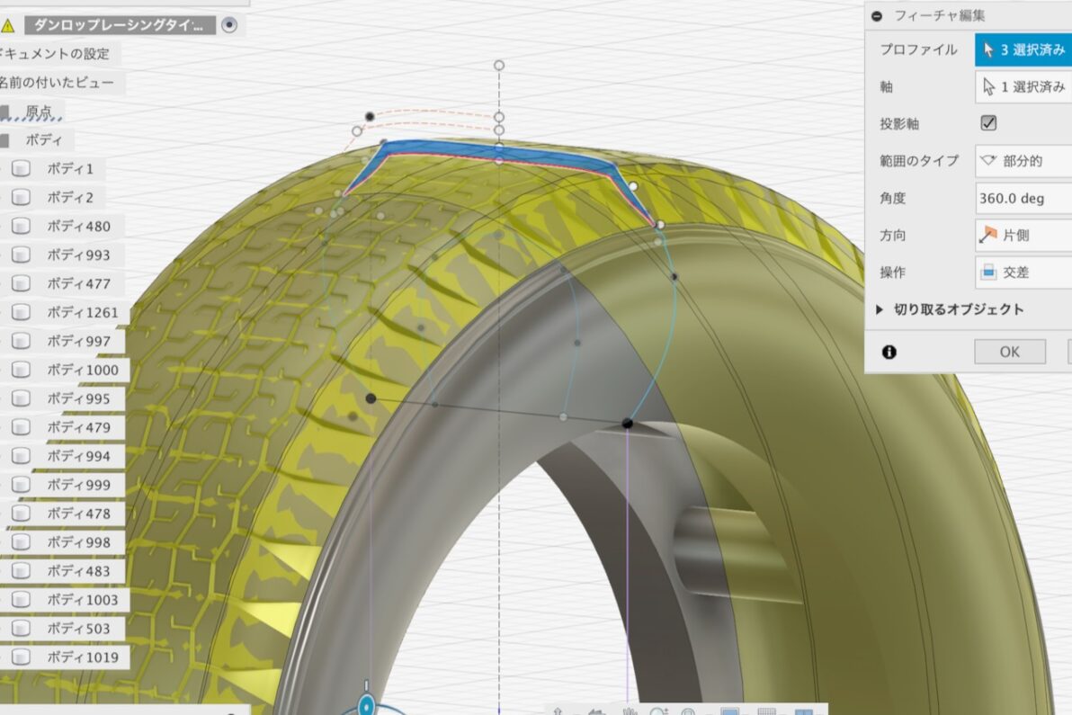 最初に基本となる断面図を描き、「回転」で作ったものを見ながらサイドウォールの膨らみやショルダー部分の角度を調整します。