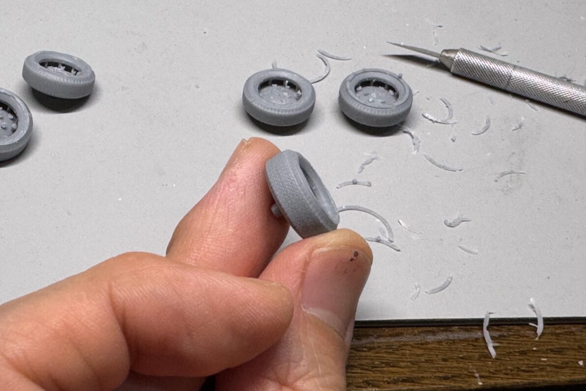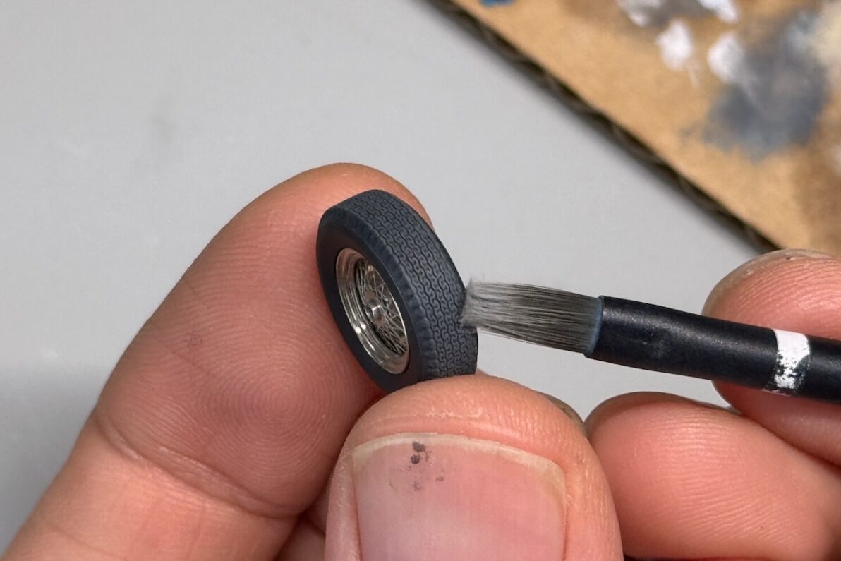 整形後に回転軸を旋盤で切り落とし、使うホイールサイズに合わせてタイヤの内径を調整。塗装は半艶の黒とジャーマングレーをエアブラシで艶っぽく吹き、乾燥後に油彩のライトグレーをドライブラシで仕上げました。