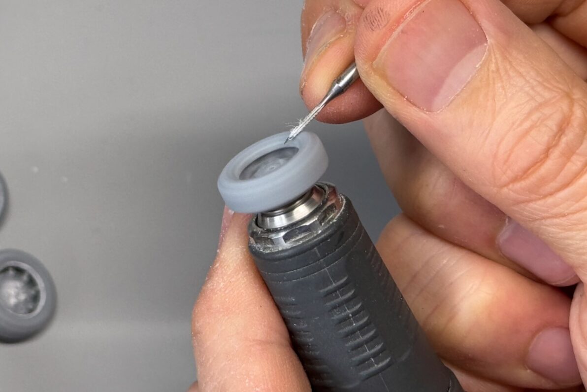 モーターツールに固定して回転させながら刃物を当て、サイドウォールの膨らみを整形します。ここはシャシー側に隠れて表からは見えませんが、車高の高いクルマの場合はきれいにしておいたほうがいいです。