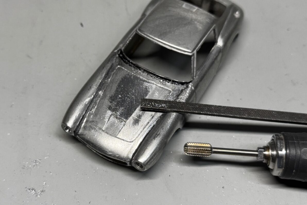 今回はボンネットのエアスクープの開口について紹介する前に、やり残していたフロントグリルの下部をやっつけます。まずはグリルの下側のボリュームが足りなく見えたので、溶かしたメタルを盛り上げてからやすりで整形しました。