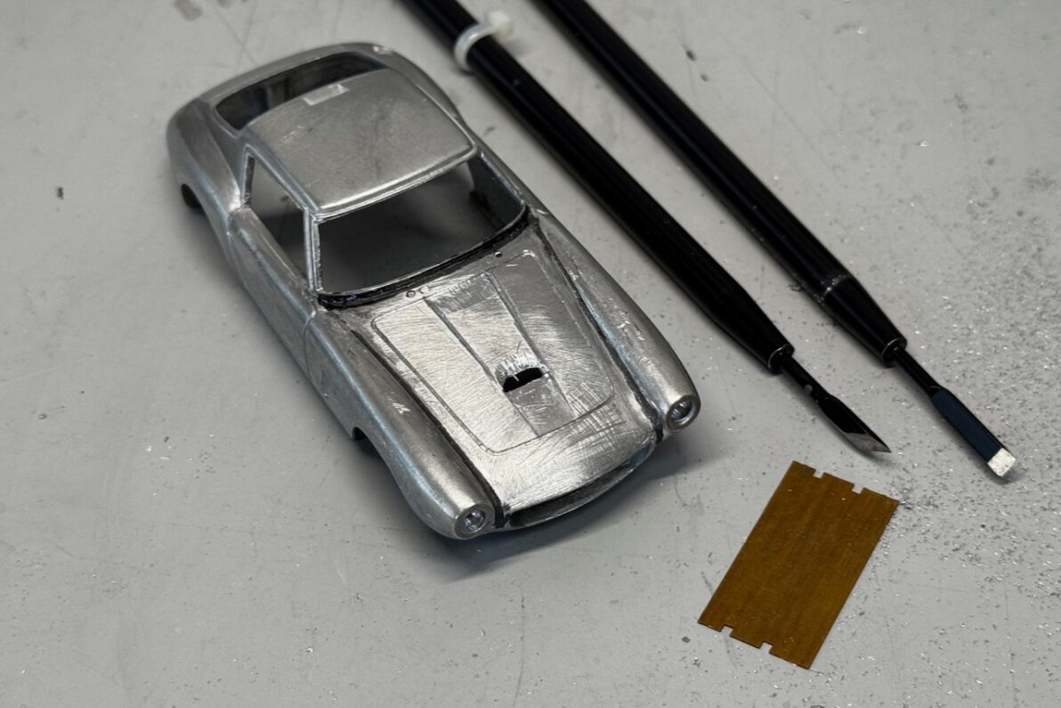 ボンネット中央のエアスクープは、金属板を曲げて作ることにします。開口部のエッジが薄くシャープになって精密感が増すのと、ボンネットの膨らみの左右差を無くすことが主な狙いです。