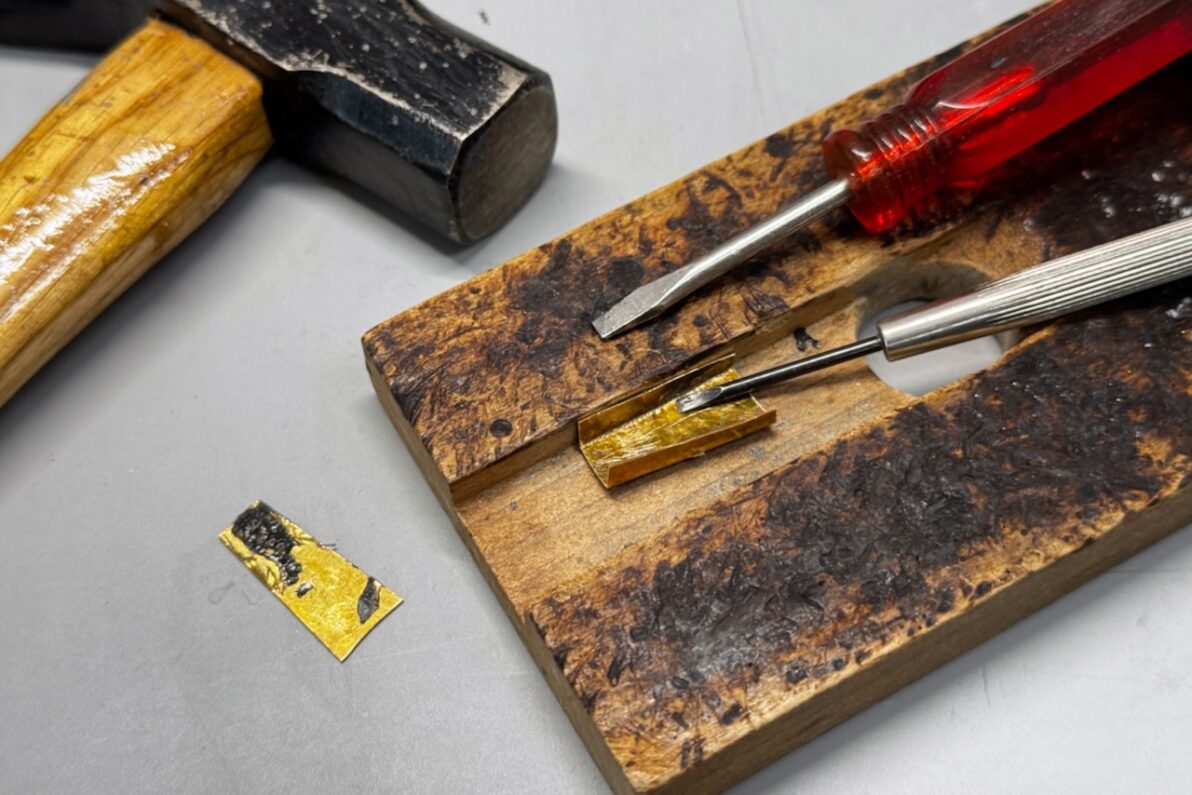 金槌で叩いて全体的に湾曲させた後、裏側に折り線をけがいてプライヤーで90度に曲げ、マイナスドライバーの先をノミのように角に当て、シャープなラインを作ります。