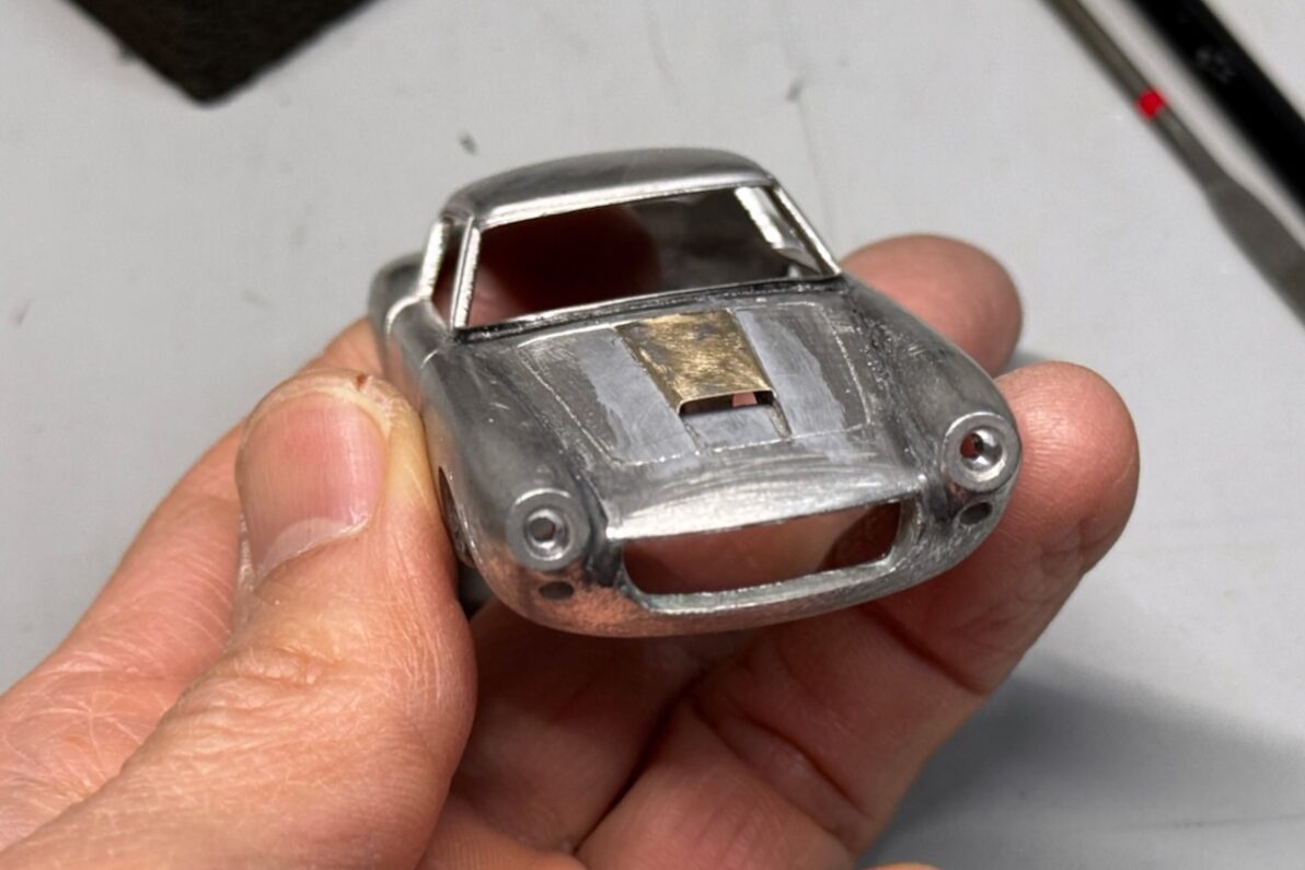 I made the central air scoop on the hood by bending a brass sheet. The main goals are to achieve thin, sharp edges for a more precise look and to eliminate any asymmetrical curves on the hood.