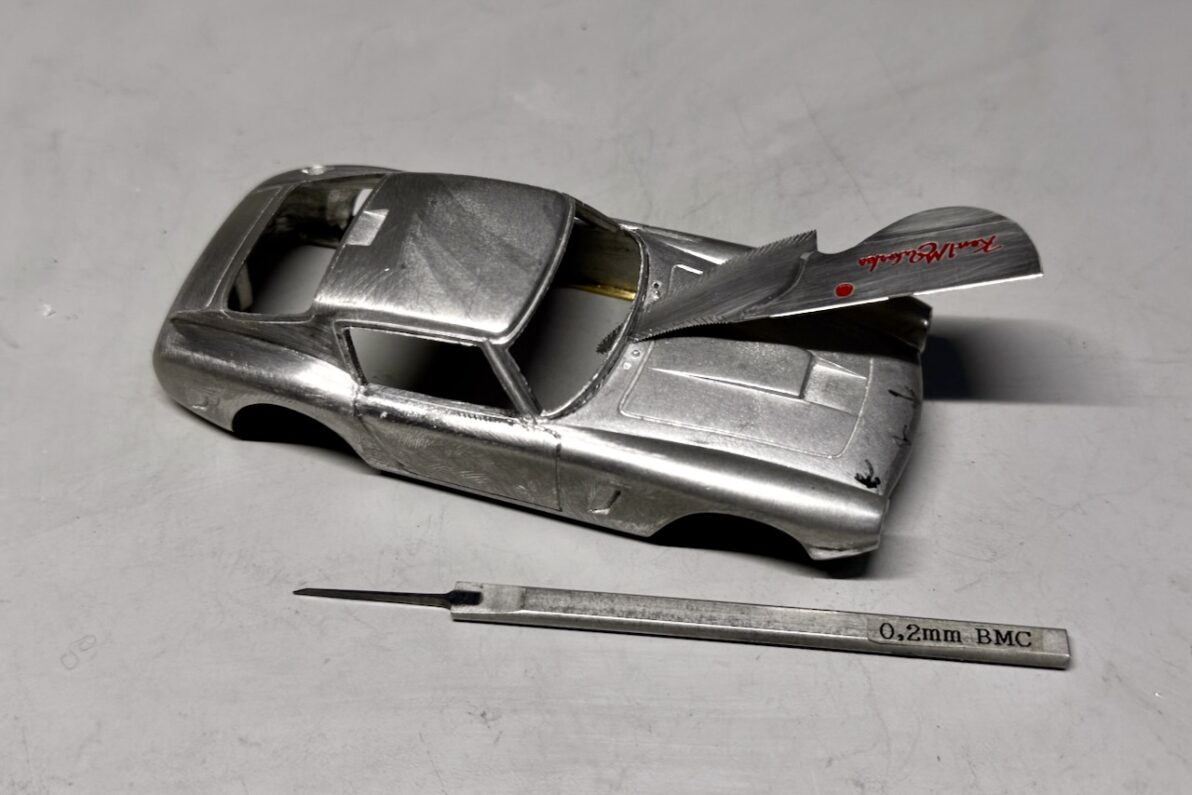 まずはボンネットの高さをかさ上げすべく、フロントウインドウの下辺にタガネとエッチングソーで切れ目を入れ、細い窓枠だけを上方に持ち上げます。