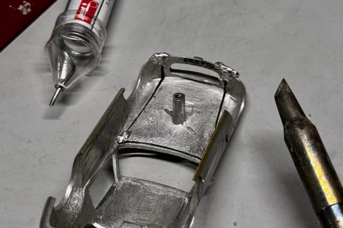 ボンネットの前端の高さも1mmほど下げてから、グリルの両脇を半田で固めます。50W以上の太めの半田コテを使わないと難しい作業かなと思います。
