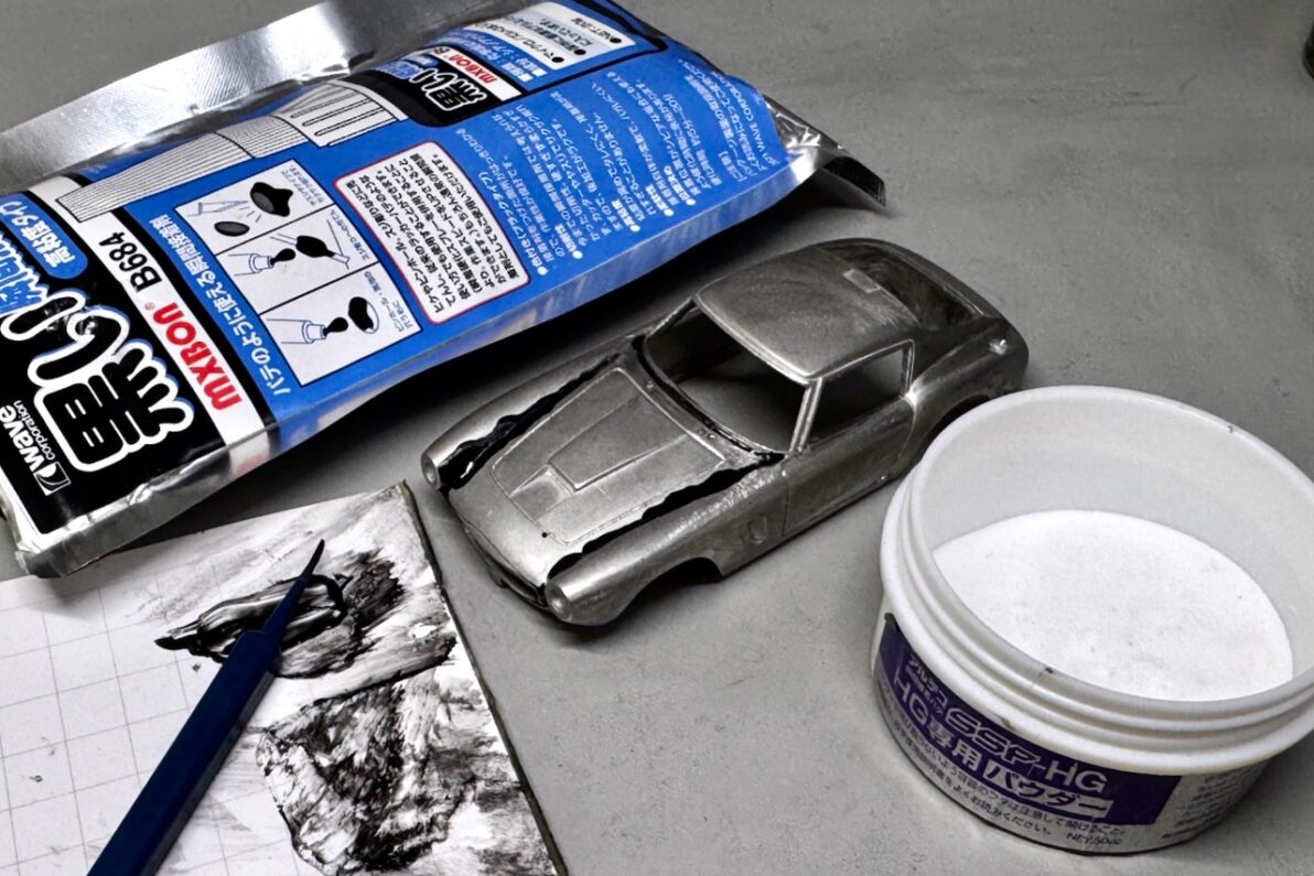 ボンネットとフェンダーの隙間埋めには、黒い瞬間接着剤にパウダーを混ぜた「黒パテ」を使いました。
