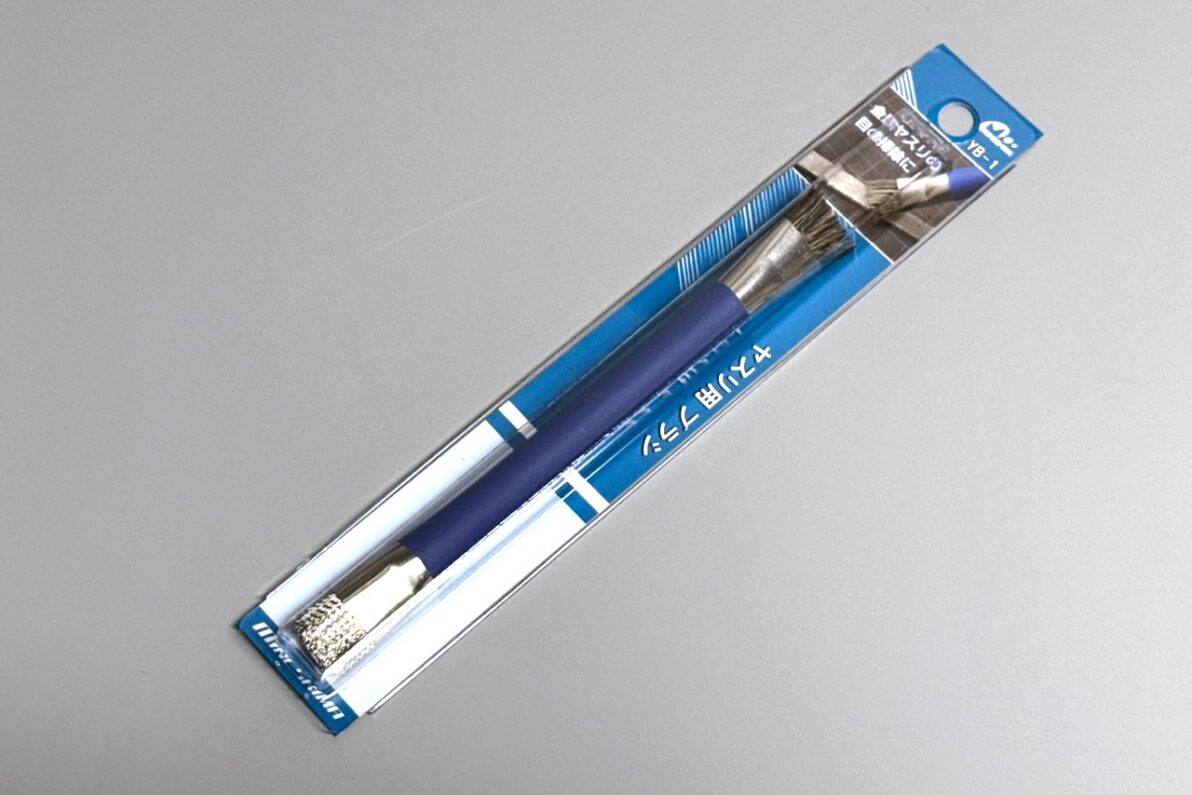 ご覧のように1本の両端に異なる素材のブラシが配置された二刀流で、プラやレジンを削った後のヤスリの詰まりは、豚毛側でかなり綺麗に掃除できます。エポキシパテやホワイトメタルなど粘りのある材質の場合は金属側を使用しますが、あまりしつこく擦るとヤスリ本来の切れ味が落ちるので、1-2回はらっても落ちない詰まりに関しては、これまで通りデザインナイフの先でちまちま弾いて取るようにしましょう。