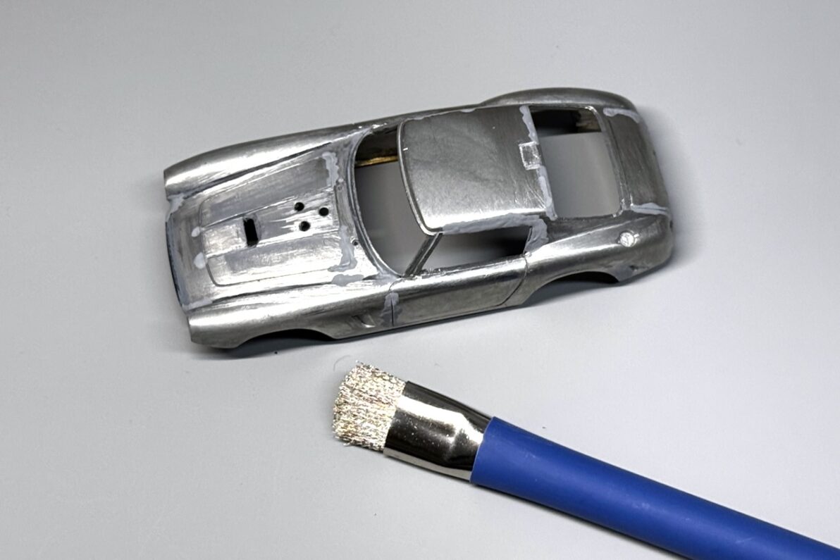 そしてこのブラシの用途はヤスリのメンテナンスだけに限らず、複雑な形状のパーツに溜まった削り粉や汚れのクリーニングにも重宝します。サーフェイサーを吹く前のアシ付け作業で、400番相当のサンドペーパーの代わり使うのも有りかなと思いました。