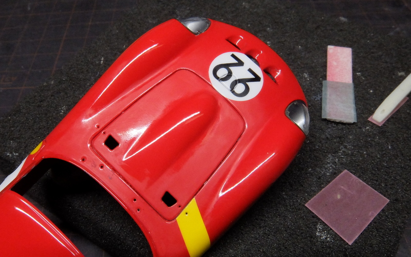 本日の製作記はクリアーコートした250GTOのボディを研いで磨くといった内容です。まずは先日ご紹介したトレカット(サンドペーパー)を使った面出しで、塗膜の表面の凹凸やうねりを平らにしてシャープな印象を狙います。