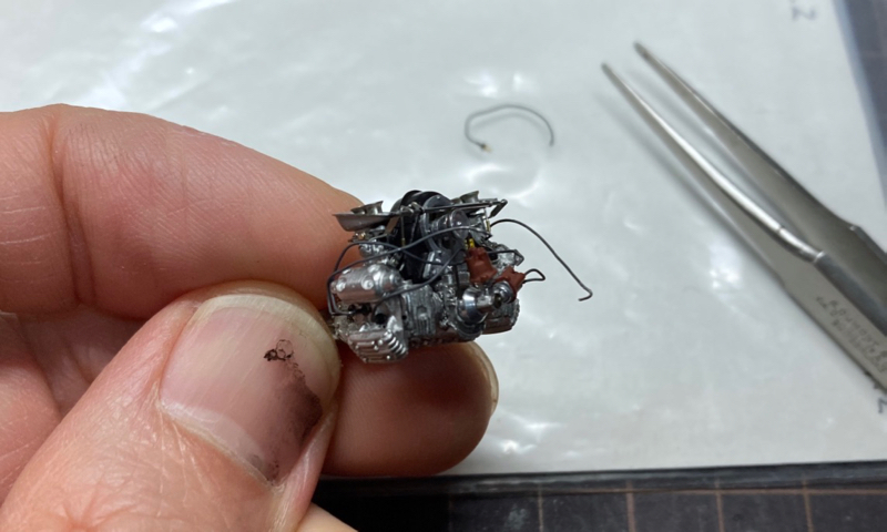 ちなみに柔らかい半田線の曲げ伸ばしには、フラットタイプのピンセットを使うと、余計な傷が入りにくいです。次回はエンジンの奥にちらっと見えるオイルフィルター等の補機類を作る予定です。