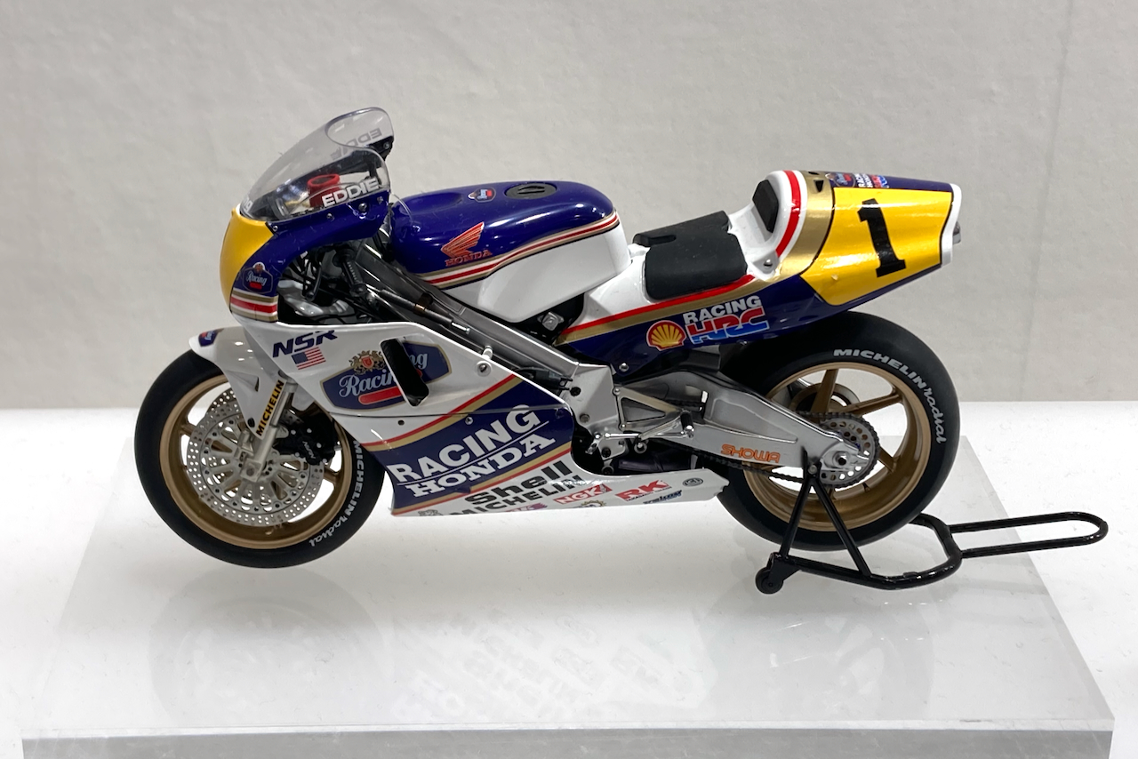 南館のAUTO art のブースに飾ってあった完成品のNSR500。やっぱりロズマンズカラーはかっこいいなと再認識させられた1台です。