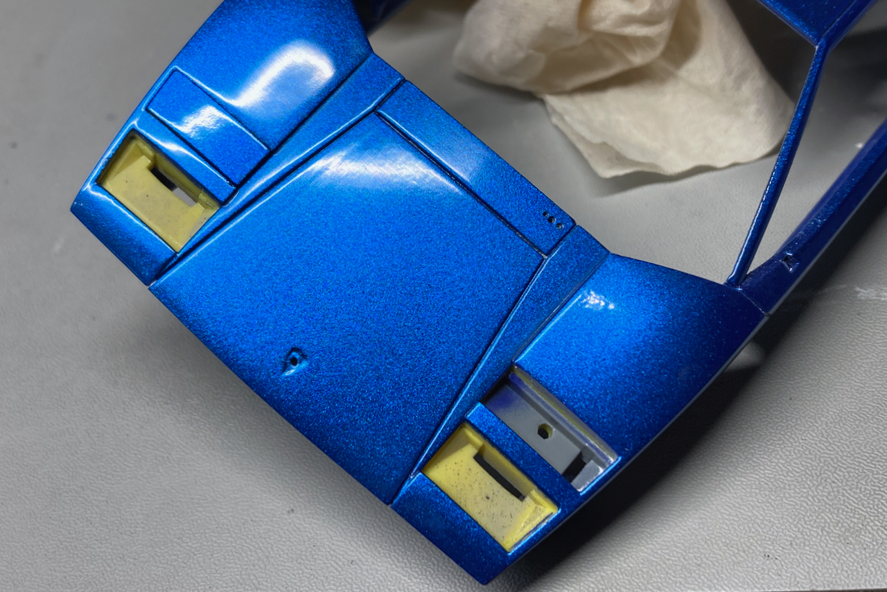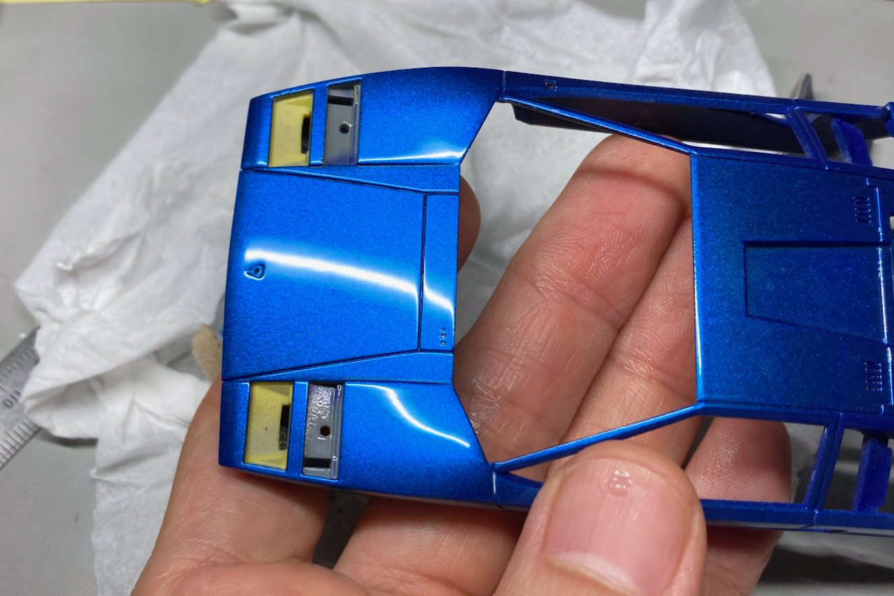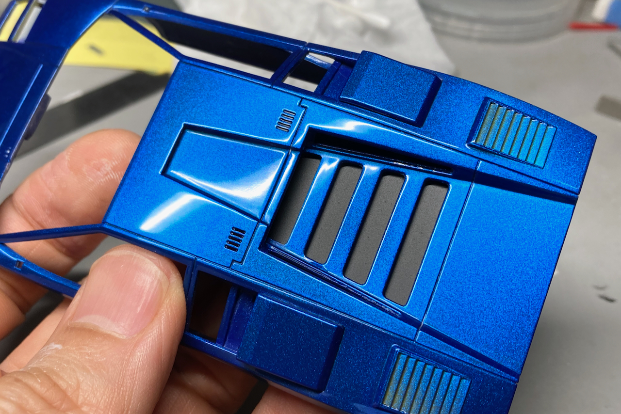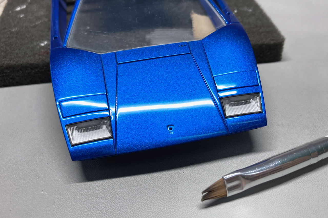 楽プラのカウンタックのクリアーコートの研磨作業の続きです。下の画像はバフレックスの後にコンパウンドの粗目と仕上げ目で、1回目の磨きを終えた状態になります。