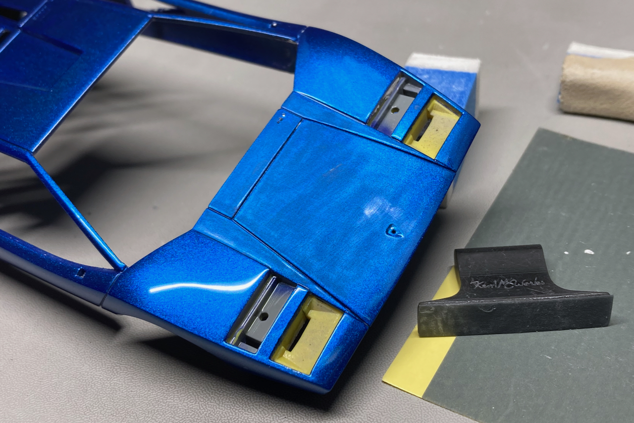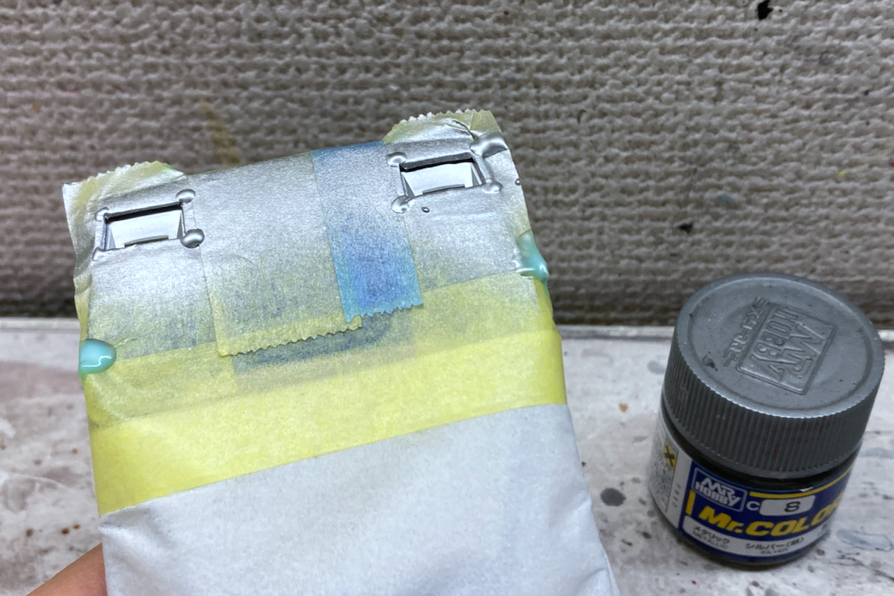 ブルーとクリアーをそれぞれ筆でタッチアップして、部分的に研ぎ出してリカバリー。周囲をマスキングして内側をシルバーで塗装します。