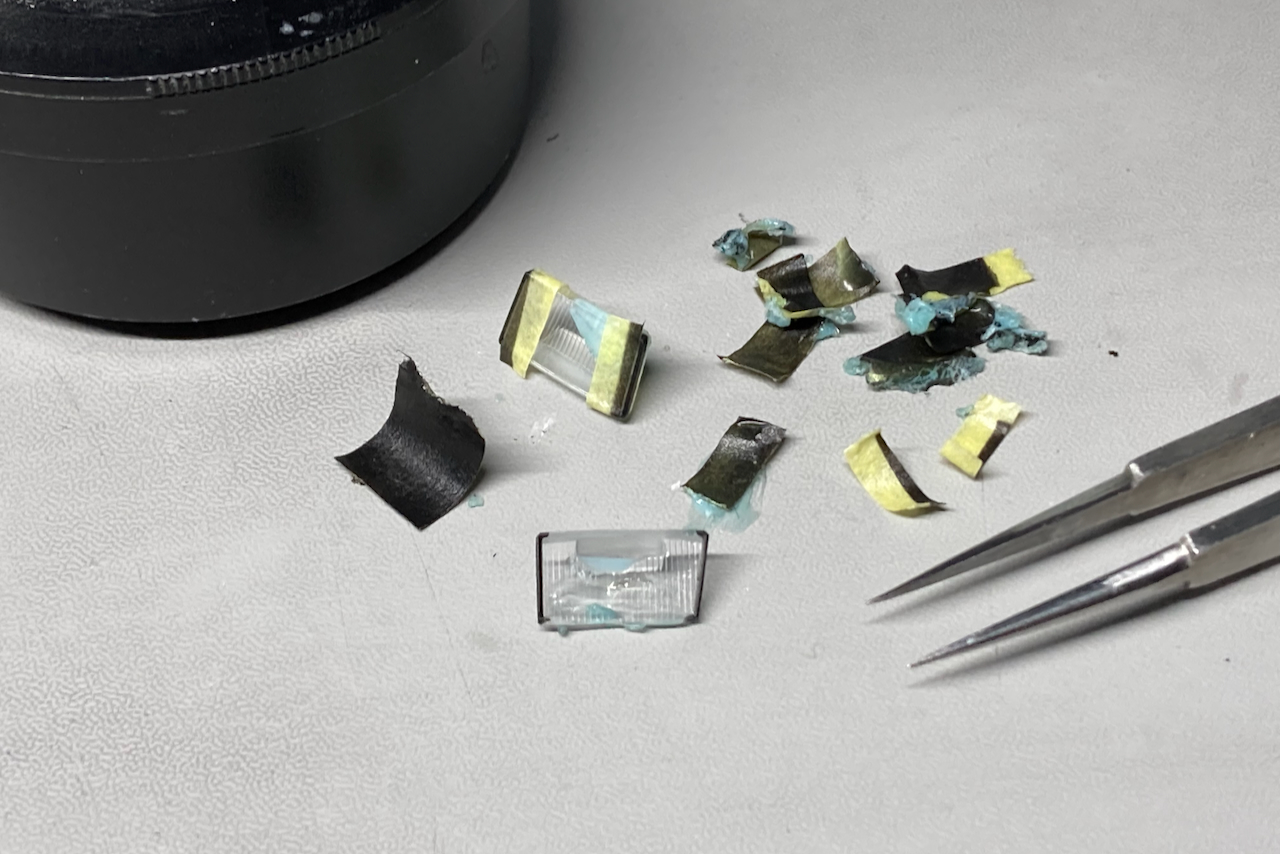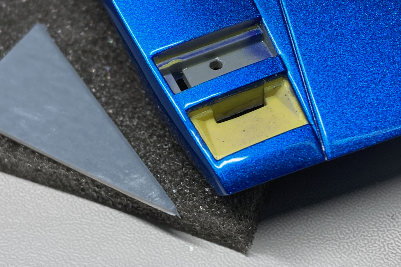 磨きの途中でライトカバーのフィットを確認するため、凹みのの側面にかかった塗膜をデザインナイフで削って調整していたら、エッジの塗膜までガリっと欠けてしまいました。