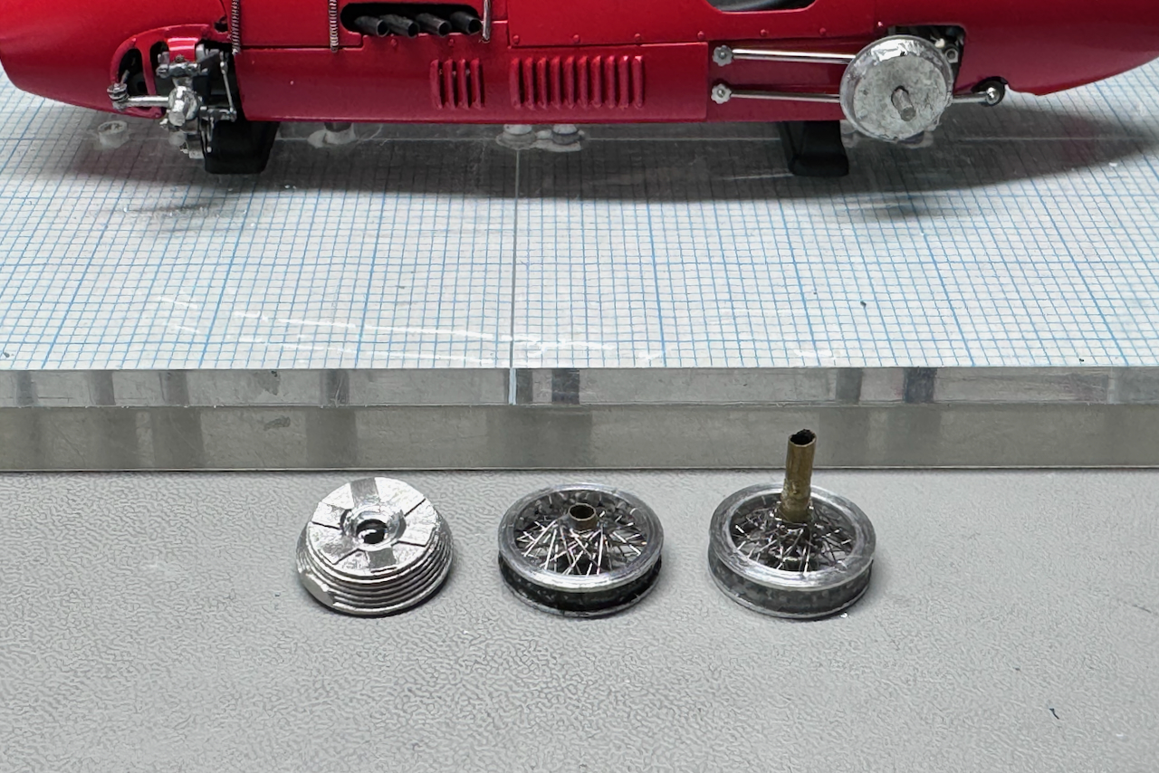 インナー側のリムは3Dプリントのタイヤに合わせて旋盤で挽き出しています。全てのパーツが揃ったところでミッチャクロンを吹き、クレオスのシルバー+ライトグレーで軽くコートしてギラつきを抑えました。