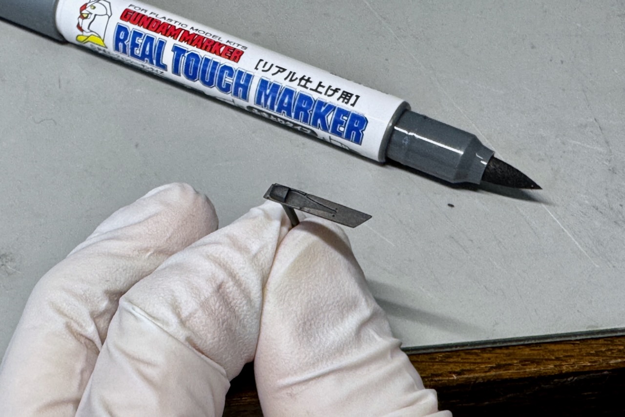 ダクトの前方部分も一体で再設計したパーツをつや消し黒で塗装、質感の違いを出すためにリアルタッチマーカーで表面を軽くなぞっています。