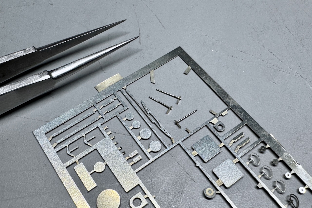 フロントウインドウの留め具は意外と目立つので、キットのエッチングに穴を開けて0.25mmの洋白線を通して半田付け。