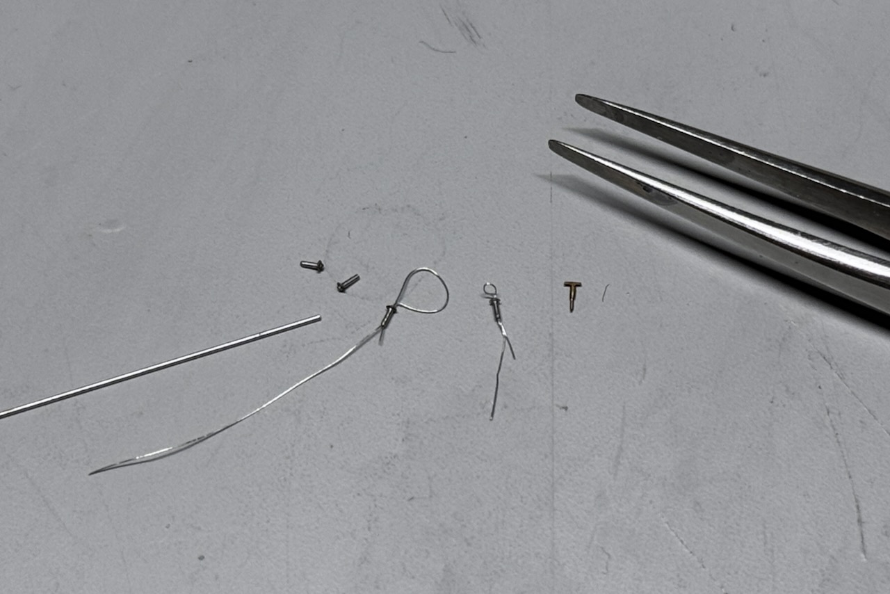 ボンネットのキャッチピンは0.4mmの真鍮パイプを軸に、エッチングの円盤を半田付けし、中央に0.1mmのワイヤーをループ状に通してあります。