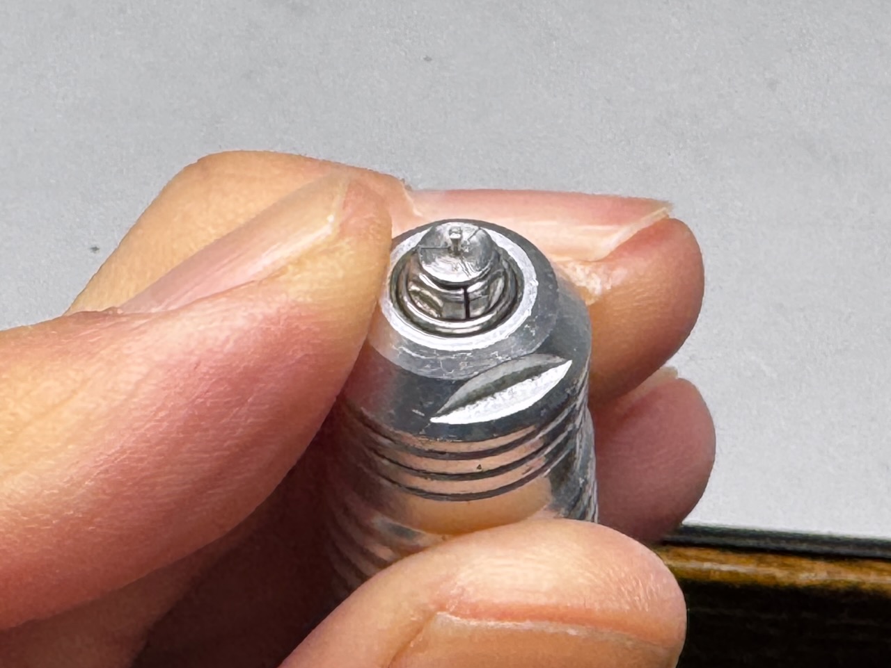 最後に残ったドアの鍵穴は、0.5mmの洋白線の断面にダイヤモンドディスクで溝を切り、プライヤーで挟んで溝の幅を1/43サイズに詰めてから0.7mmの真鍮パイプを重ねて半田付けして立体感を出しました。