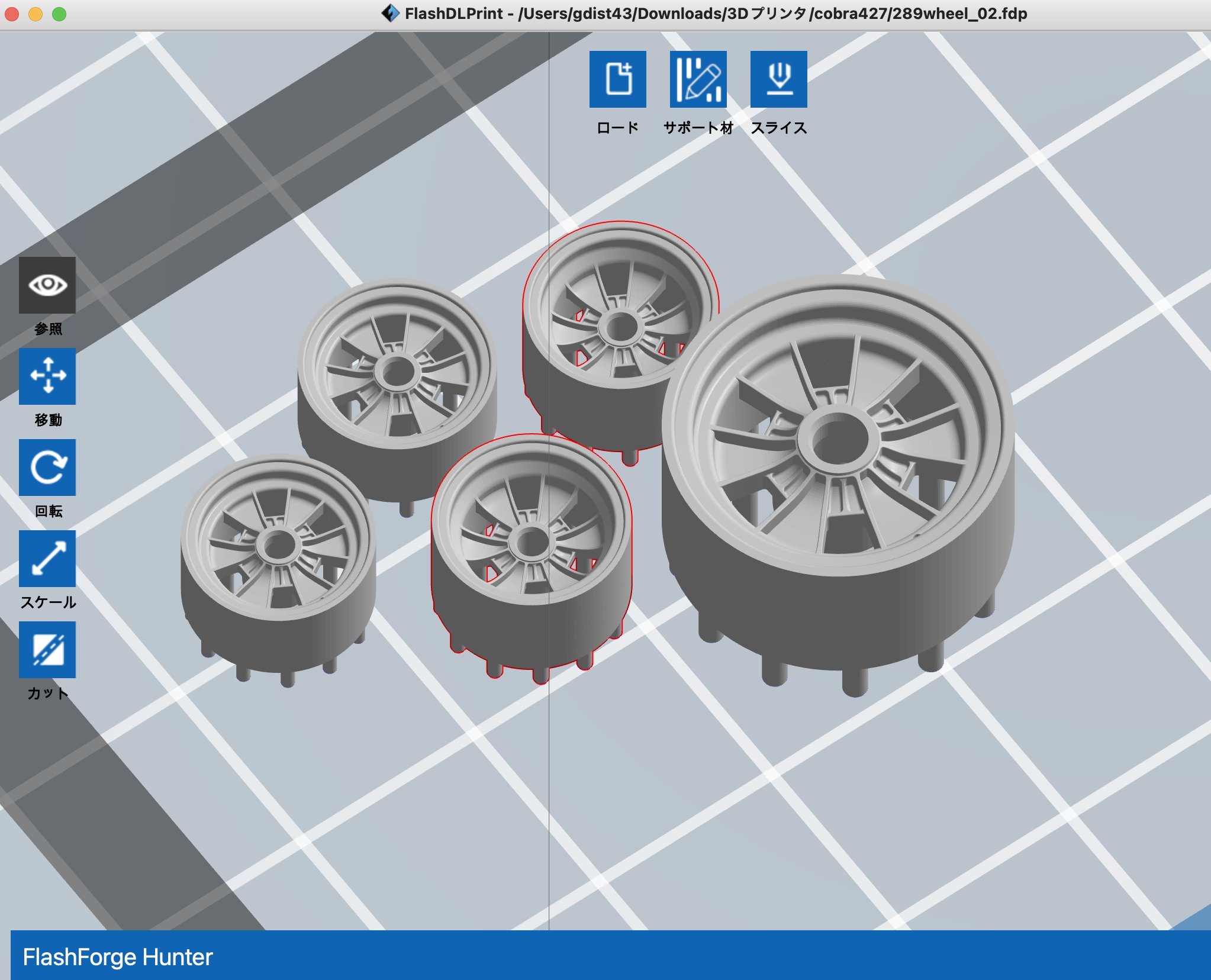 ここで1回目のプリント。画面前列の左からプロトタイプ2個/フロント用2個、中列がリア用、後列は微妙に形を違えたフロント用で、ホイールの外径を2%刻みで大小折り混ぜプリントしました。