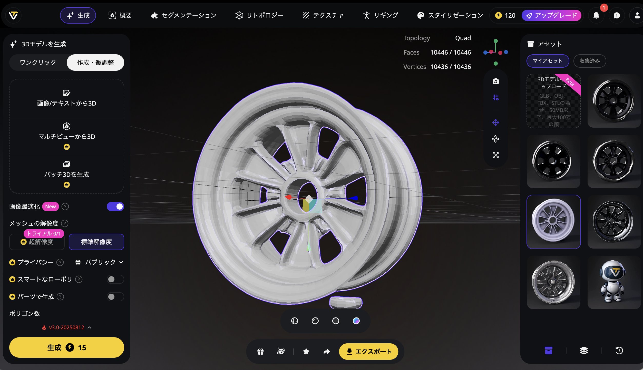 流行りの生成AIを模型制作に活かせないかな?と思い、TripoAIにコブラ289のMarvicホイールの画像をアップロードし、「車のホイール、斜め上から見た画像」と補足説明を加え、ポリゴンモデルを作ってもらいました。
