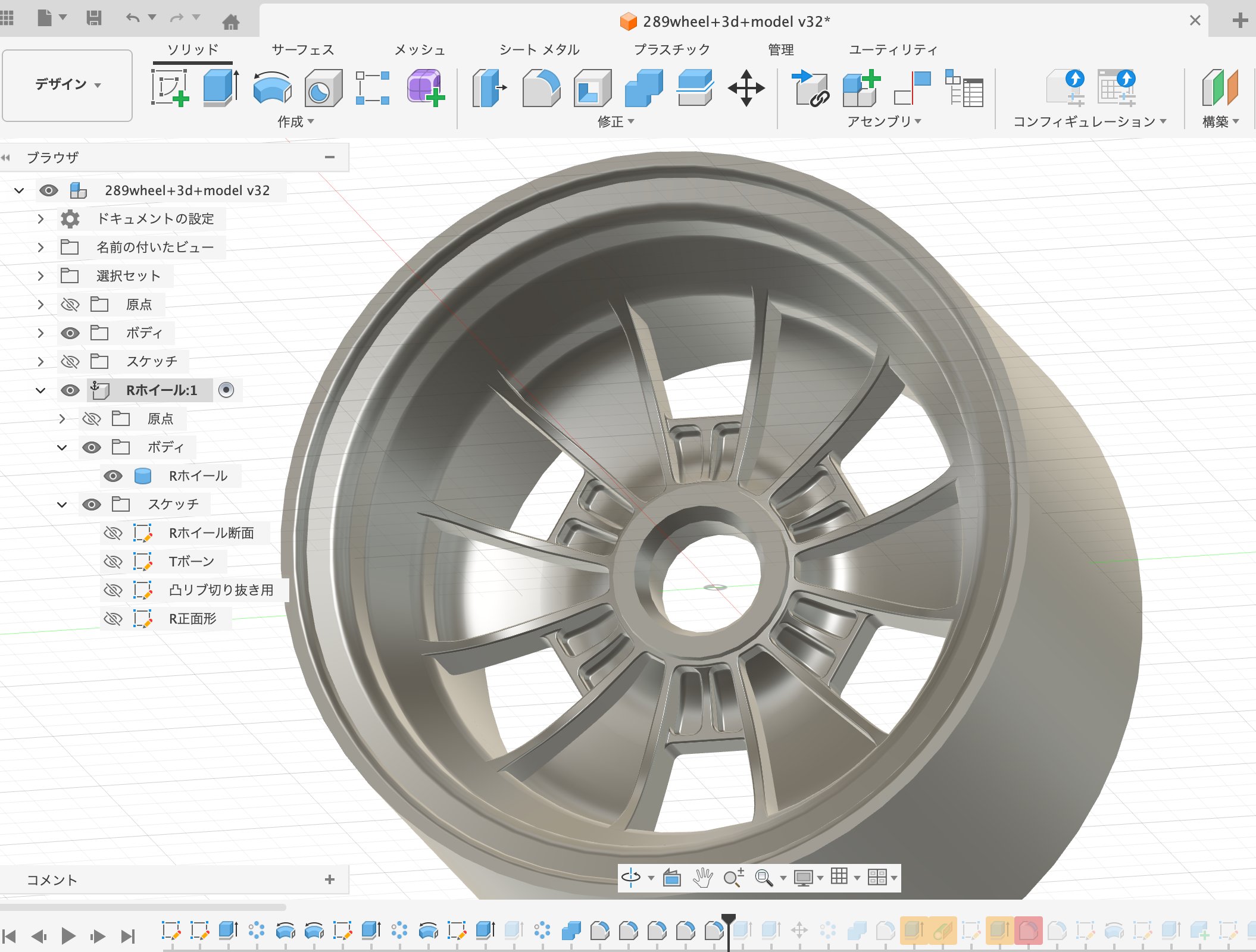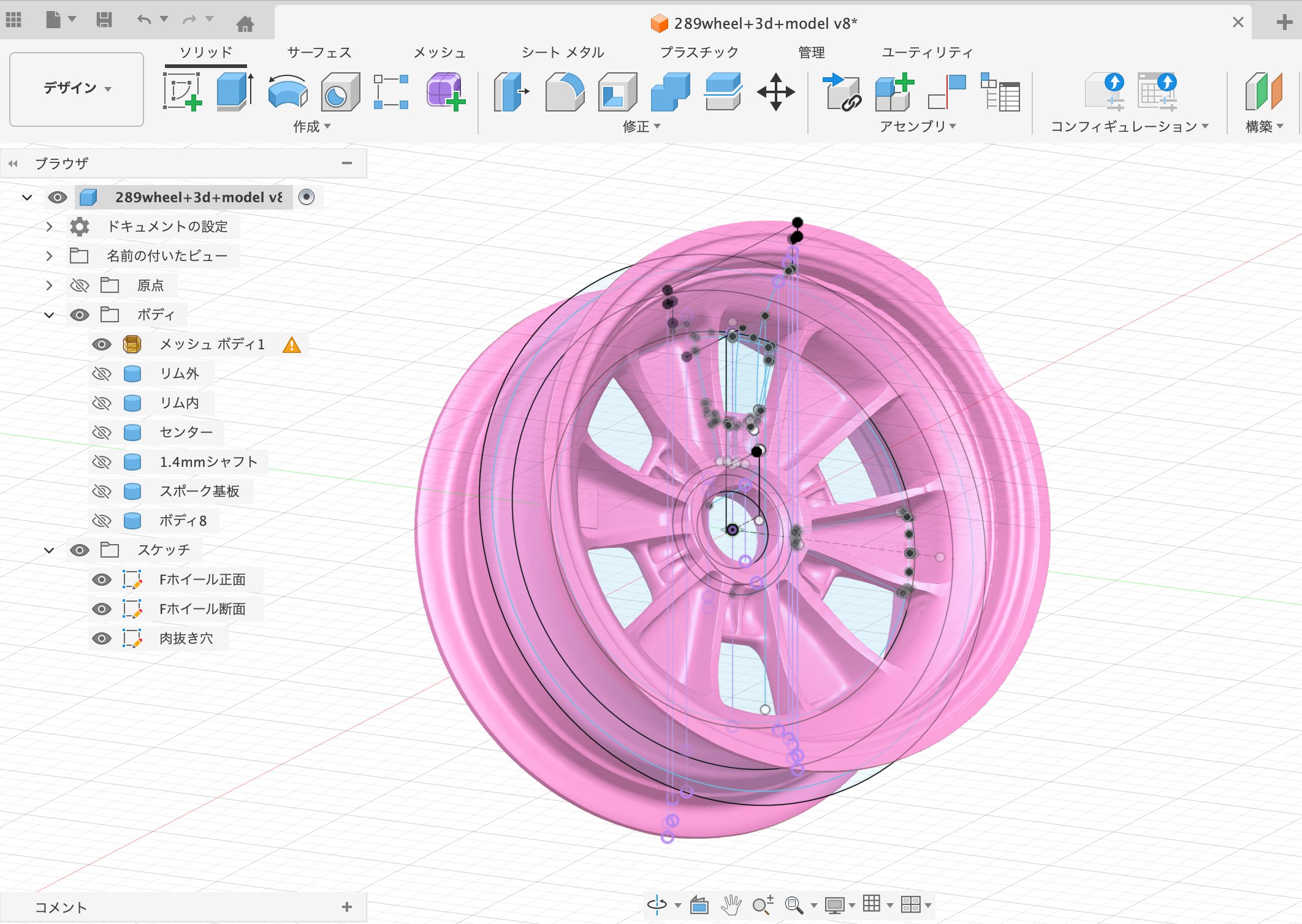 よく見るとリムの一部が欠けてますが、3Dモデリングの叩き台としては十分使えそうなので、STL形式でダウンロードしてFusionに読み込み、外形をなぞって立体化。スポークの凹みの深さなど、いつもはノギスや目分量で試行錯誤していた手間が省けてありがたいです。