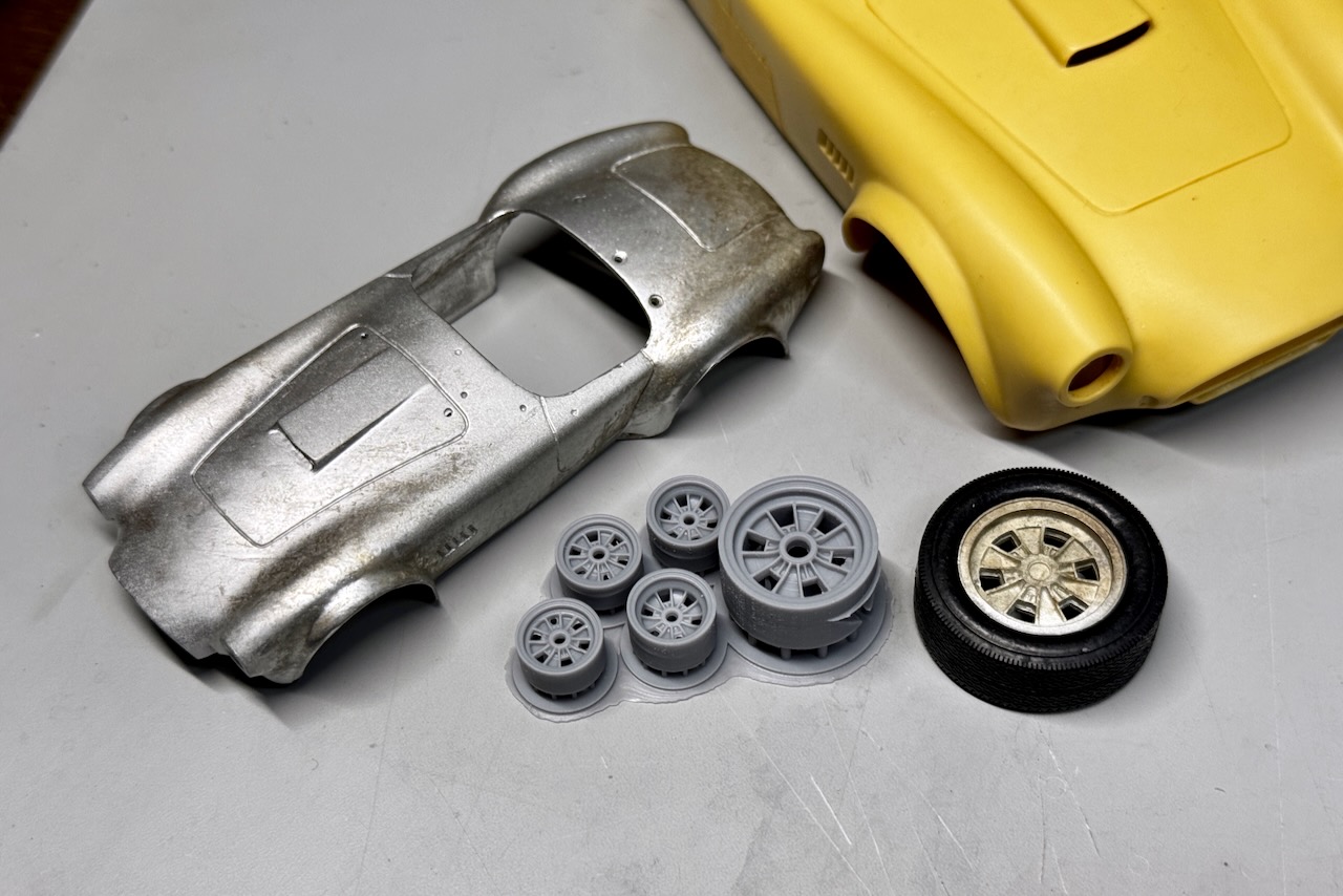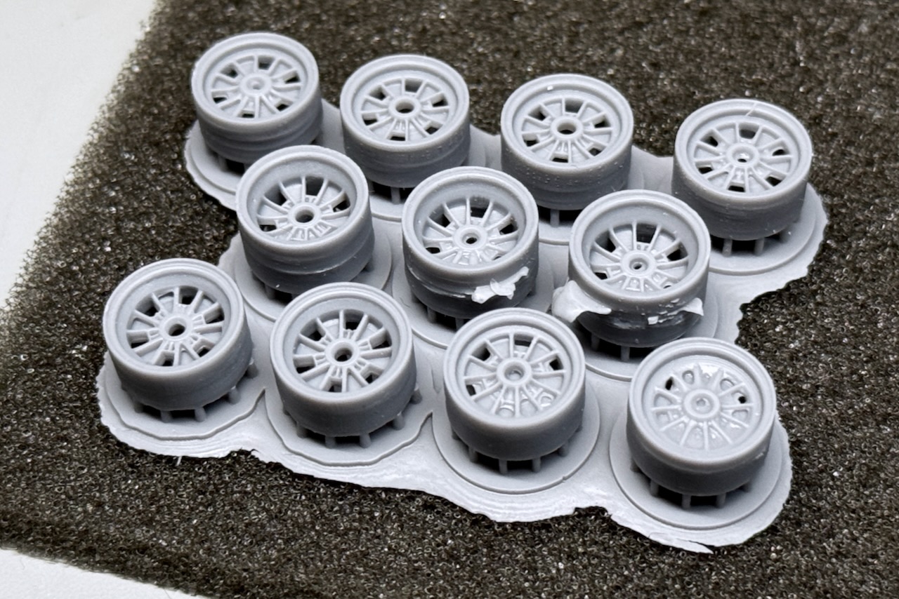 上がってきた現物を見ながらリムの深さやフィレットの丸みを修正して、2回目のプリントへ。もしかしたら1/24スケールにも転用できるかな?と思い、ひとつだけ外形17mmに拡大したものも混ぜました。