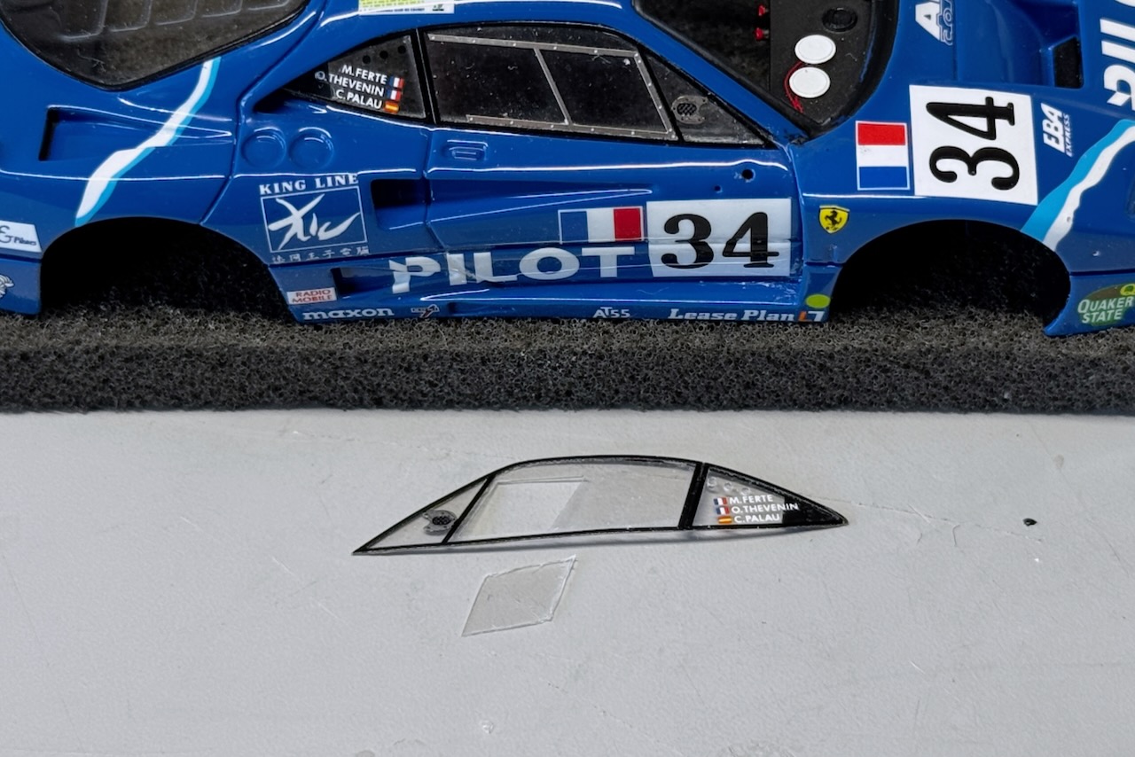 フロントウインドウはエッジを若干削ってやや下にズラす感じでフィットさせましたが、リアの窓枠はどうにもならず、後方中央の目立たないところで1mmほど切り詰めて、一回り小さくサイズ調整しました。