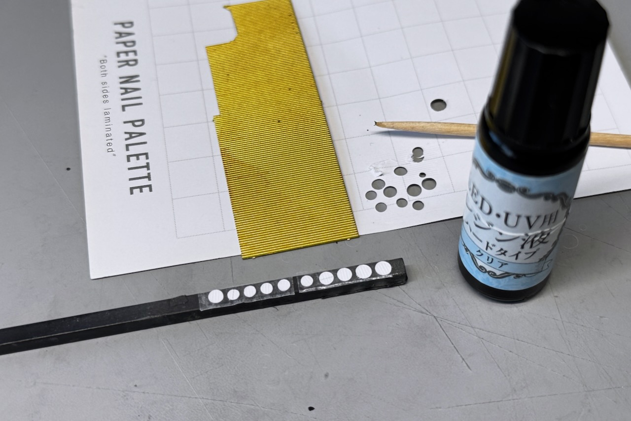 ペーパーパレットの上でUVレジンを硬化させると、いとも簡単に剥がせる性質を利用し、エッチングの波板と爪楊枝でパレットの上に凹凸を作り、それをサークルカッターで切り抜いた上にレジンを盛り上げ、カット入りのレンズを自作しています。