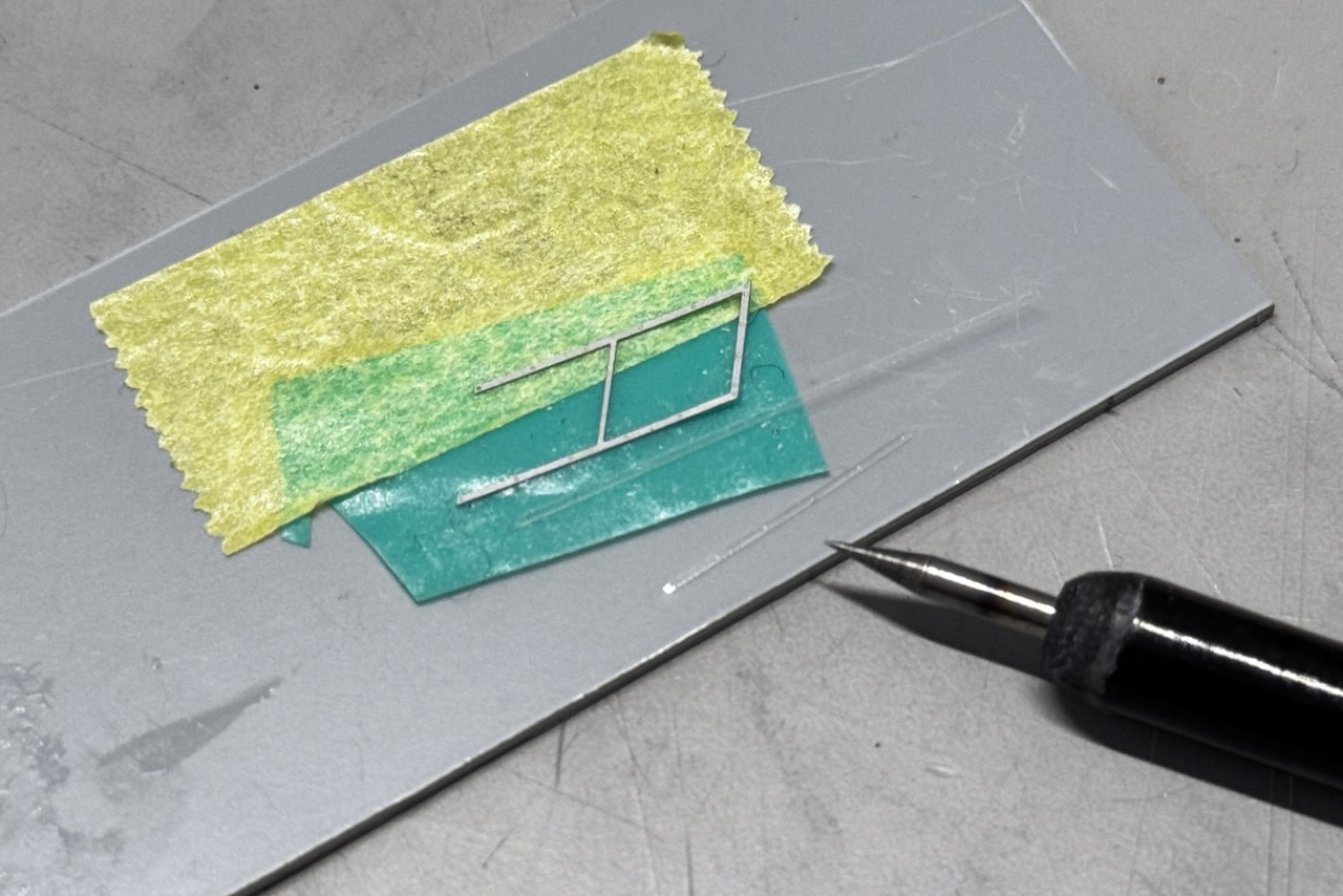 サイドウインドウの小窓はエッチングの枠は使わず、デザインナイフで開口部を切り取り、アニメセルで作った菱形の窓を重ね付けしてスライド窓っぽい構造を再現してみましょう。
