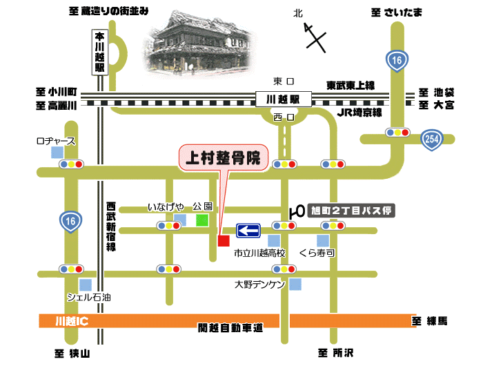 東武東上線、JR埼京線「川越」駅の西口から徒歩15分 西武新宿線「本川越」駅から徒歩25分 いずれも西武バス『今福中台行き』に乗り,「旭町2丁目」で下車すると便利です。
